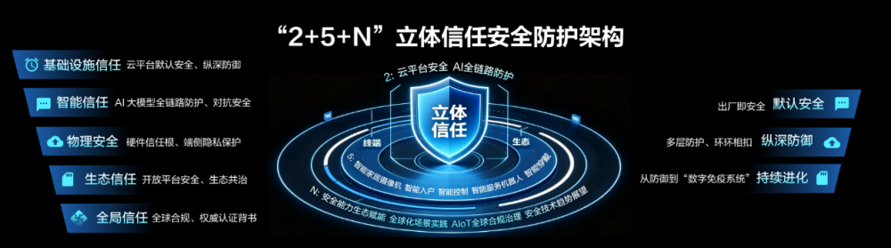 从具体结构来看,“2”是两大核心底座,即云平台安全和AI全链路防护;“5”是智能家居摄像机、智能入户、智能控制、智能服务机器人、智能穿戴五类自研硬件;“N”则延伸至开放平台、全球化场景实践和AIoT全球合规治理以及安全趋势展望等环节。白皮书同时提出“默认安全、纵深防御、持续进化”三项原则,强调将安全能力前置到设计和出厂阶段,通过多层防护降低单点失效风险,并推动安全体系从被动防御向动态演进方向发展。